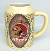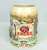 49ERS - San Francisco 49ers stein. This 5 3/4" stein was made in Brazil by Ceramarte. Football players, in high relief, are featured along with an outline of a football with a SF football helmet with San Francisco above and 49ers, below. NFL Officially Licensed Product Hologram is on the bottom of the stein. Generic box.$22.00