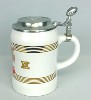 SF49 - 1991 San Francisco 49ers lidded stein. This 7 1/4" lidded stein was made in Mexico for CUI, Inc. Gold shield with SF Forty Niners, on the front. Gold colored N for National League, on both sides of the stein. Gold colored NFL logo on ceramic insert on top of the lid. A miniature pewter football is the thumblift. Underneath reads: A National Football League Collectors Stein. Individually numbered and comes with a certificate of authenticity. Generic box.$45.00