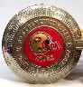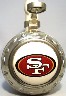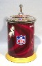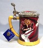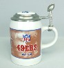 FMSF49 - San Francisco 49er's lidded stein. This 6 1/8" lidded stein was made in China for the Franklin Mint. Features a NFL logo in the middle. A 49ers player kicking off, on the left and a 49ers helmet, on the right. Raised field numbers surround the outer part of the lid, with a raised helmet and lettering: San Francisco 49ers National Football League. A minature football is the thumblift. Has Franklin Mint's tag on the handle and a NFL hologram sticker on the bottom. Generic box.$39.00 No tag