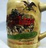 CS19-N - 1980 " 8 Horse Team & Wagon " Budweiser � Holiday stein. 1st in the Holiday stein series. This 5" stein was made in Brazil by Ceramarte. Features an 8 Horse Hitch traveling over a grassy path. The raised area of the stein is visible without the A&Eagle logo above the wagon. Did not come boxed.OUT