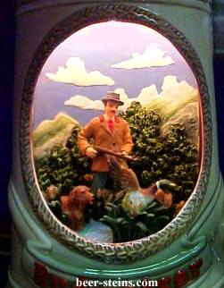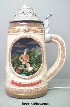 538809 --- 1998 Budweiser � Hunting Stein Bar NiteLite. Made by Enesco, this 9 1/2" tall electric nitelite features a hunter with his dog, getting ready to bag a mallard duck, inside the resin earthenware stein replica. Lights up inside when turned on. Gift boxed.OUT
