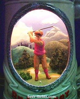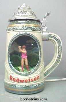 538817 --- 1998 Budweiser � Golfing Stein Bar NiteLite. Made by Enesco, this 9 1/2" tall electric nitelite features a golfer with a 3D background, getting ready to hit a golfball, inside the resin earthenware stein replica. Lights up inside when turned on. Gift boxed.OUT