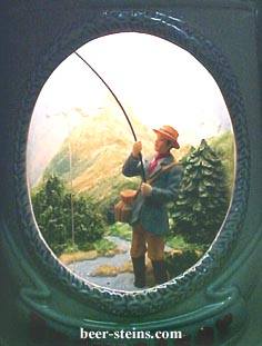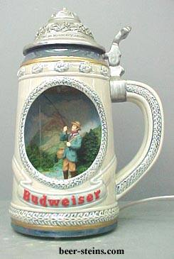 538825 --- 1998 Budweiser � Fishing Stein Bar NiteLite. Made by Enesco, this 9 1/2" tall electric nitelite features a fisherman pulling a fish out of the water, inside the resin earthenware stein replica. Lights up inside when turned on. Gift boxed.OUT