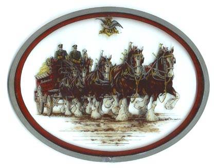 N4207 --- Made in 1993, this beautiful stained glass suncatcher is an (counting lead frame) 6 3/4" by 8 5/8" oval. Features the Clydesdales Team & Wagon with a large A&Eagle � above. Very, very colorful. Secured by a leaded frame with chain for hanging. Made in the USA by Glassmasters of The Stained Glass Guild. Boxed. Brand new, never displayed condition. Comes with caring for your stained glass and history of stained glass as an ancient art info sheet.OUT