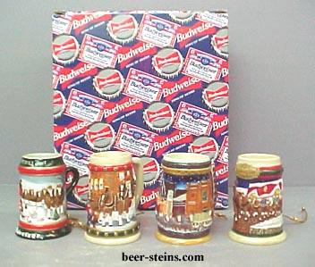 N8215 --- 2000 - Set of 4 minature resin Anheuser-Busch � replica mini steins. These 2" mini steins are replicas of the 1991, 1994, 1997 & 1998 holiday steins. Made by Enesco. Gift boxed.OUT