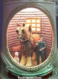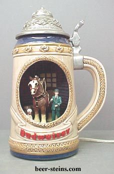 N7738 --- 1998 Budweiser � Clydesdales Stein Bar NiteLite. Made by Enesco, this 9 1/2" tall electric nitelite features a Clydesdale, dalmatian and handler inside the resin earthenware stein replica. Lights up inside when turned on. Enesco's # is 504521. Gift boxed.OUT