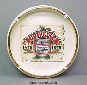 AB100A - 1976 Budweiser � 100 Years Anniversary ashtray. This ashtray was made in the USA and measures 6 7/8" in diameter with a depth of 1". 4 indentations around gold rim for a cig to rest. Not boxed.$35.00