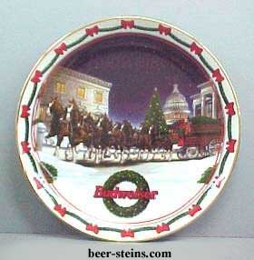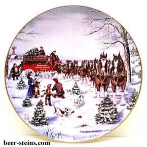 N9101 - 2005 " Holiday " plate. The 17th in the series of holiday plates. Artist Lonnie Busch depicts Budweiser's Team & Wagon as they travel through the snow, against a full moon lit starry sky. Plate is 8 1/4" in diameter. Individually numbered and comes with a certificate of authenticity. Boxed.$24.00