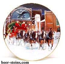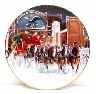 N9103 - 2006 " Holiday " plate. The 18th in the series of holiday plates. Made in the USA by Heartland China. Designed by Jeff Wack. Depicts Budweiser's Team & Wagon departing their historic stables on a late winter's evening. Plate is 8 1/4" in diameter. Individually numbered and comes with a certificate of authenticity. Boxed.$24.00
