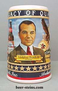 STCONVIII 2003 State Convention stein. The 3rd in the series of the "Busch Family". This 6 1/8" stein was made in Brazil by Ceramarte. Features Adolphus Busch III, who was President from 1934 to 1946. Gives history of his performance on the bottom of the stein. Individually numbered. Did not come boxed. Available to Budweiser's Beer Distributors only.