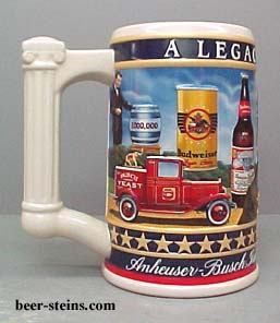 CS523 Marketing Milestones 1860-1919 lidded stein. This 8� lidded stein was made in Brazil by Ceramarte. The 1st in a series of three steins commemorating some of the most memorable icons of Anheuser-Busch�s advertising history. This �Marketing Milestones� series features the 1st stein that features a number of the promotional items and product introductions, from 1860 to 1919, that helped make Anheuser-Busch � one of America�s largest brewers by the early 1900�s. Individually numbered with a certificate of authenticity. Gift boxed. $48.00