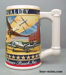 CS568 Air Force lidded stein. This 8 �� lidded stein was made in Brazil by Ceramarte. This is the 2nd of 5 steins in the new �U.S. Armed Forces� series of steins. The Air Force emblem is showcased in the center of the stein, resting atop a patriotic collage of American military symbols. On either side of the seal are detailed, full-color, framed illustrations by artist Keith Summer. One highlights Air Force personnel of various ranks; the other, various types of aircraft. The pewter thumbrest features Anheuser-Busch�s famous A&Eagle � logo. A raised American flag tops the lid. Individually numbered and comes with a certificate of authenticity. Gift boxed. OUT