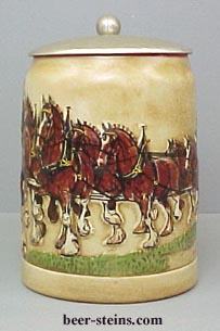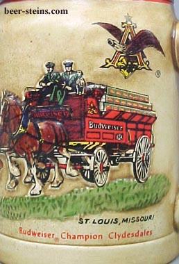 CS19 - 1980 " Budweiser ® Champion Clydesdales " Holiday stein. The 1st in Budweiser's Holiday stein series. This 5" stein was made in Brazil by Ceramarte. Features an 8 Horse Hitch traveling over a grassy path. Did not come boxed.$89.00