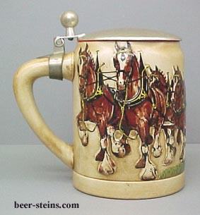 CS29 - 1980 " Budweiser ® Champion Clydesdales " Holiday lidded stein. This 5 7/8" lidded stein was made in Brazil by Ceramarte. Same as the 1980 unlidded Holiday stein but comes with a pounded type lid with a ball thumbrest. With age, lids darken with a patina. Did not come boxed.OUT