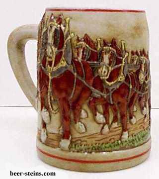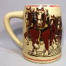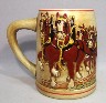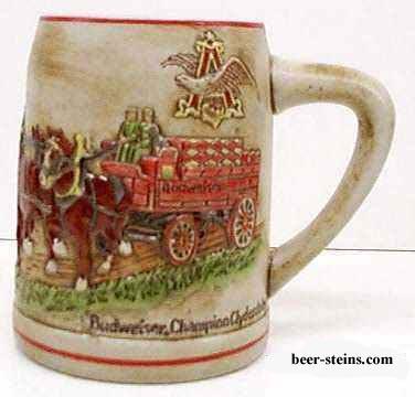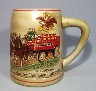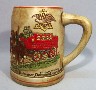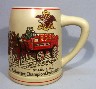 CS19 - 1980 " 8 Horse Team & Wagon " Budweiser � Holiday stein. 1st in the Holiday stein series. This 5" stein was made in Brazil by Ceramarte. Features an 8 Horse Hitch traveling over a grassy path. Did not come boxed.$89.00