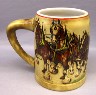 CS19-N - 1980 " 8 Horse Team & Wagon " Budweiser � Holiday stein. 1st in the Holiday stein series. This 5" stein was made in Brazil by Ceramarte. Features an 8 Horse Hitch traveling over a grassy path. The raised area of the stein is visible without the A&Eagle logo above the wagon. Did not come boxed.OUT
