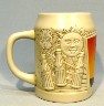 CCSS - THE SUN stein. This 5 1/2" stein was made in Brazil by Ceramarte. The sides of the stein are in high relief. Shows the Sun holding a bottle of Coca-Cola on the front with the Coca-Cola button. Gift boxed.PRICE: $22.00