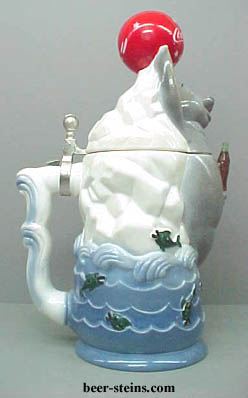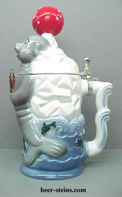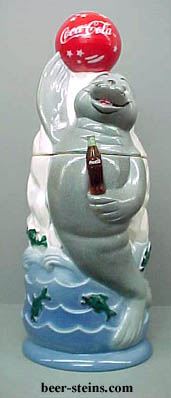 4451 - 1998 SEAL CHARACTER lidded stein. The Seal is playing with a red ball decorated with stars and the " Coca-Cola " text in Spencerian script on this 11 3/8" lidded stein. The Coca-Cola Seal is holding a minature Coca-Cola contour bottle. Behind the Seal is an iceburg and at the bottom of the stein is water and several leaping fish. Waves form the stein handle. A limited edition size is 5000. Each stein is individually numbered and comes with a postcard size certificate of authenticity. Made in Germany. Generic box.PRICE: OUT