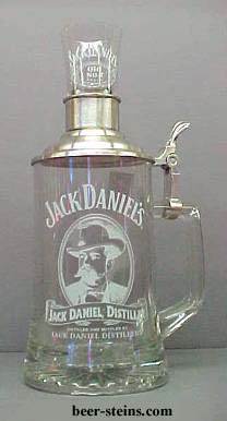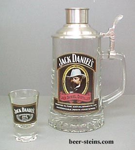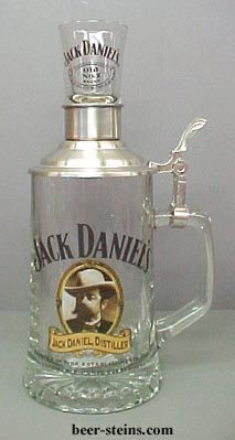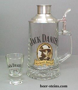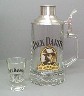 5584 - Jack Daniel's glass Father & Son stein with shotglass. This 9 1/2" lidded stein with shotglass is decorated with the Jack Daniel's Swing logo and Mr. Jack's Cameo in a etched white design. The shot glass depicts the Jack Daniel's Swing logo and Old No. 7 with Cartouche logo. The shot glass fits into the lid on top. Generic box.