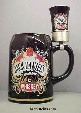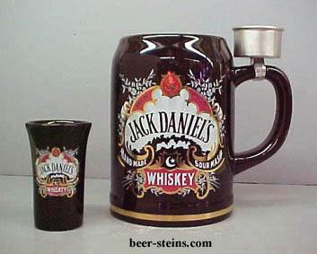 5580 - Jack Daniel's Father & Son stoneware stein. This 7 3/4" stein features a very unique design on the front and back that was recreated from an antique label used in the early 1800's stating " Jack Daniel's Hand Made Sour Mash Rich Mellow Whiskey ". The design is high fired in the 3 colors of white, red and metallic gold. A minature version appears once on the 2oz shot glass. A pewter shot glass holder is permanently attached to the handle. Generic box.OUT