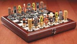 8551 - Jack Daniel's Lynchburg Chess set. Highly-detailed, 32 sculpted and painted pieces complimented by a top-quality wooden board branded with the Jack Daniel's logo. KING: Jack Daniel was born in 1850 and he learned to make whiskey at an early age. By the time he was 16 years old, his distillery had become the first to be registered by the United States government. His Tennessee Whiskey is now enjoyed in more than 135 countries. QUEEN: One of the earliest names given to Jack Daniel's Tennessee Whiskey was " Belle of Lincoln ". Lynchburg was once a part of Lincoln County and Mr. Jack had earned a reputation of being quite the "ladies man". The distillery released a commemorative Belle of Lincoln decanter in the 1970's. BISHOP: Corn is the dominant grain used in making Jack Daniel's Tennessee Whiskey, accounting for anywhere from 51 to 88 percent of the raw ingredients used. The corn is shipped to Lynchburg from farms in Illinois and Indiana. The other grains used to make Jack Daniel's are rye and barley malt. KNIGHT: When Jack Daniel had trouble opening the distillery's safe one morning in 1905, he gave it a good kick out of frustration. Unfortunately, the injury to his toe became serious and got progressively worse. Gangrene eventually set in and six years after the original incident, Mr. Jack Daniel died. ROOK: It could be said that the charcoal-mellowing processs that Jack Daniel's uses begins with a rick of hard sugar maple wood. A rick is carefully burned to make the charcoal that will be placed in vats. Jack Daniel's is filtered through these charcoal-mellowing vats before going into the aging warehouses. PAWN: A bottle of Jack Daniel's Old No. 7 is recognized throughout the world by it's black and white label and its unique square shape. Jack Daniel decided on using a square bottle in 1895 after a salesman with Illinois Alton Glass Company showed him the design. Black Label came along around 1911. Board doubles as a carrying case for the pieces. Dimensions: 15-1/2"W x 15-1/2"D x 2-1/4"H. Gift boxed.