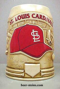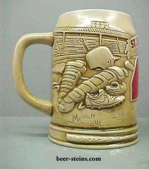 STLCAR - This high relief 5 1/2" unlidded stein was made in Brazil by Ceramarte. Features a St Louis Cardinals' baseball cap. On both sides of the cap are examples of equipment, gloves, etc used in the game. Gift boxed.OUT