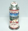 STLCBS - 2001 St. Louis Cardinals lidded stein. This 9 1/2" lidded stein was made in China for the Danbury Mint. This heavy stein features many images of Busch Stadium with the Arch and Downtown Skyline on the right and the Stan Musial statue on the left. Raised domed polished lid features the Cardinals logo, on the ceramic insert. Recessed into the thumbrest is a raised STL logo. � MBI, on the bottom. Came in a styrofoam box inside a white cardboard outer box.OUT Generic box