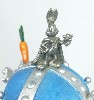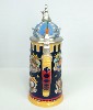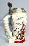 --------------Nine seperate Coats of Arms appear on this stein and each one showcases one particular Looney Tunes character: His Highness Bugs Bunny, Ye Olde Yosemite Sam, Road Runner the Swift, Wile E. Coyote the Crafty, Tweety the Lionhearted, Sylvester the Jester, Duke Daffy the Duck, Friar Porky the Pig and Taz the Terrible. Every shield is in raised relief and entirely handpainted. The pewter lid is adorned with a resin cast king's crown and sitting on top of the crown is a pewterized Bugs Bunny with crown and robe. The thumblift is a pewter carrot. Castle turrets and banners are the borders. Generic box. (Discontinued)OUT