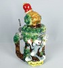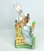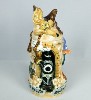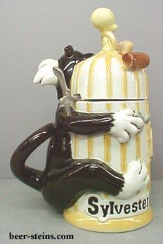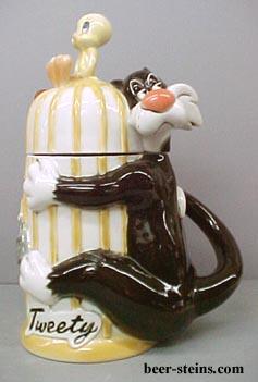 -------------- This stein depicts Sylvester wrapped around the bird cage with an over confident look on his face. He holds the key to the " ACME " lock on the cage door. Little does he know that Tweety has long since vacated the cage and sits innocently on top of the cage, ready to use the ever present mallet. We see these two just moments before Tweety rings Sylvester's bell. Made in Germany, this lidded porcelain stein is hand painted. Individually numbered. Generic box. (Discontinued)OUT
