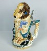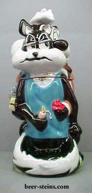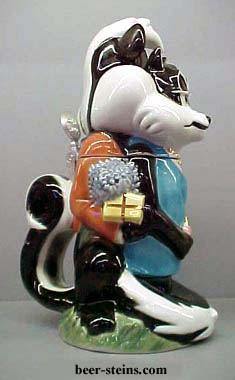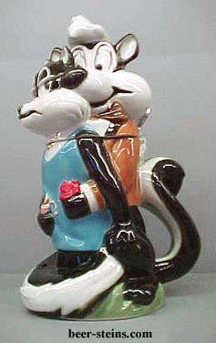 --------------Ooh la la! L'amour! First appearing in " Odor-Able Kitty " in 1945, Pepe's cartoons were flavored with hilarious phrases of pidgin French. The consummate French lover, Pepe combines the suavity of Charles Boyer with the boyish charm of Maurice Chevalier and brings the art of love to new heights. Like all great lovers, the flames of Pepe's passions are only fanned higher by any resistance to his charms. And no one resists more than poor Penelope. While Pepe is instantly smitten by Cupid's arrow, Penelope believes their love can never be. But Pepe knows that love is blind and scentless. He cheerfully overlooks the fact that Penelope is just a cat. The scene portrayed by Pepe Le Pew & Penelope is of Pepe showering Penelope with gifts and flowers as an attempt to win her affection. Penelope, with perfume bottle in hand, shows a skillful degree of both resistance and allure. Is it any wonder that Pepe so valiantly tries to win her affection? Both characters are well dressed, Pepe in tuxedo and Penelope in pearls. Pepe's tail forms the handle of the stein. Made in Germany, this 10" lidded porcelain stein is hand painted. Individually numbered. Generic box. (Discontinued)