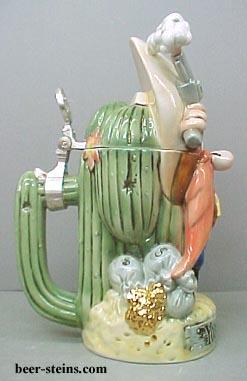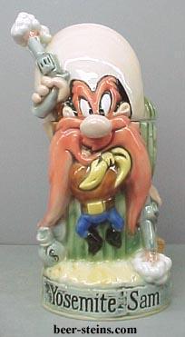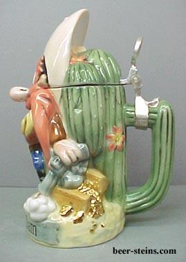 -------------- This stein presents Yosemite Sam in a hootin' hollerin pose. Gold coins pour out of money bags and a treasure chest on either side of him. He's leaping in the air, with his six guns blazing. Is he celebrating his new found wealth or has he backed up against the needles of the huge saguaro cactus behind him? Below Yosemite Sam is an old and weathered "wood" board, in which the star's name has beed carved. The pewter thumblift is formed in the shape of the famous Looney Tunes logo. Made in Germany, this lidded porcelain stein is hand painted. Individually numbered. Generic box. (Discontinued)OUT